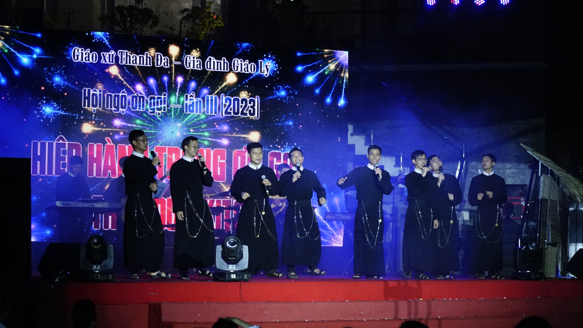 Đúng 19:00 ngày 22.04.2023, cha phó Giuse khai mạc đêm diễn nguyện. Tiết mục mở màn do chính cha sáng tác “Theo bước Đức Vua” được các tu sĩ khách mời trình bày. Tiếp đến, các Hội Dòng lần lượt trình bày tiết mục của mình theo thứ tự đã được lên chương trình. Xen vào phần giao lưu văn nghệ, là phần giao lưu giữa MC và thiếu nhi Giáo xứ Thanh Đa. Câu hỏi được đặt ra cho các em là về trang phục của các Hội Dòng tham dự. Chỉ cần nói đúng tên, hoặc đơn giản là “khen đẹp,” như MC Hồng Kỳ pha trò, thì cũng đã giành được phần thưởng của ban tổ chức. Một niềm vui nho nhỏ, nhưng là một dịp để tu phục của các Hội Dòng được quảng bá và nhận biết bởi thiếu nhi Giáo xứ Thanh Đa.